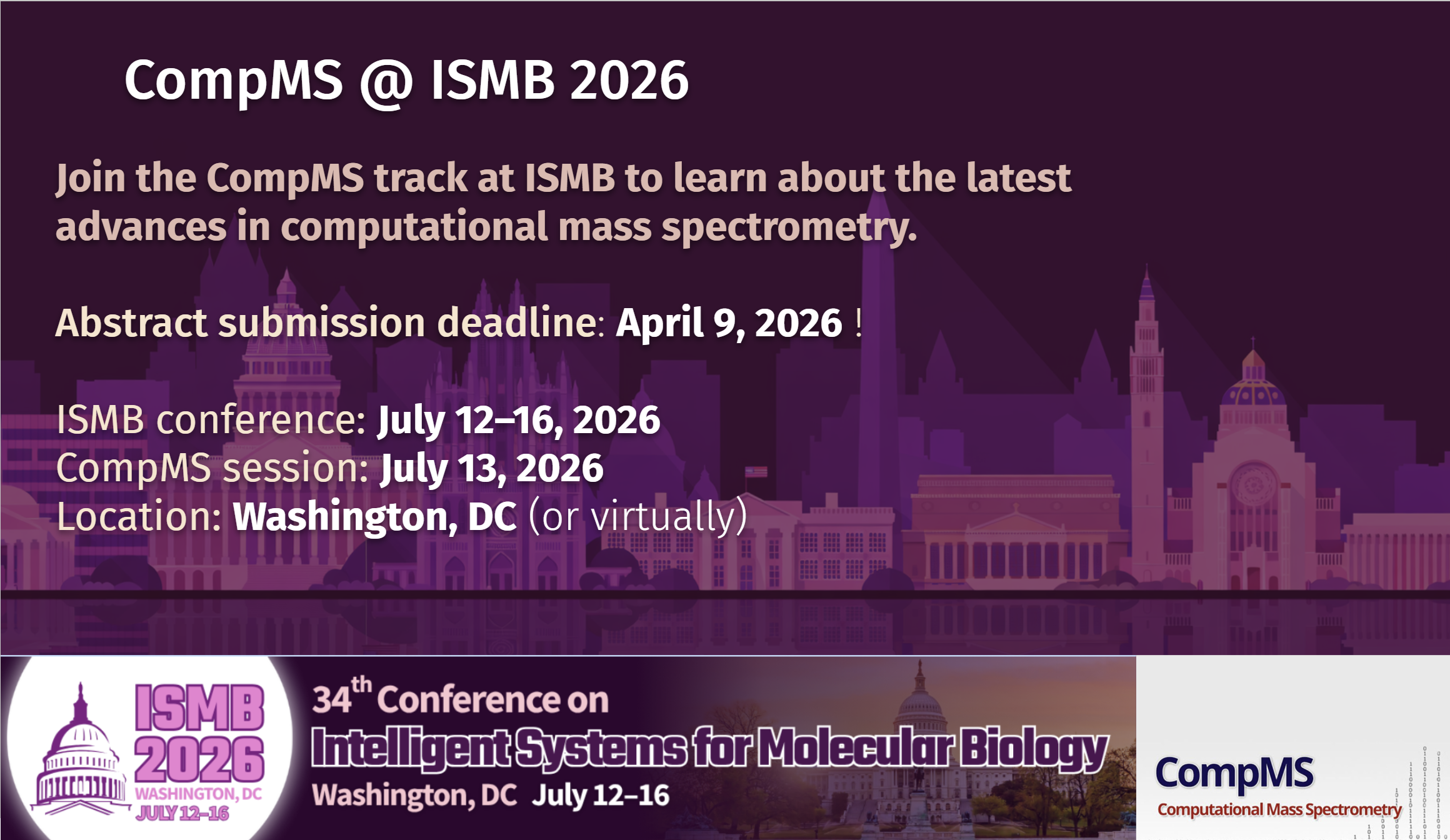 Join us at ISMB 2026 in Washington, DC (or virtually) on July 12–16, 2026, and attend the Computational Mass Spectrometry (CompMS) COSI session. Key dates: April 9: Abstract submission deadline May 5: Talk/poster acceptance notifications July 12–16: ISMB conference July 13: CompMS COSI <----- Submit your abstract & select CompMS COSI: https://www.iscb.org/ismb2026/call-for-submissions/abstracts [cid:cba2f83c-b58b-485e-8251-effa0edb365d]